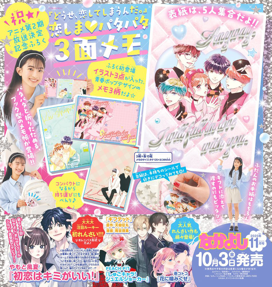 - コミックス170万部突破&アニメ第2期放送決定で恋しま旋風、ノンストップ! なかよし11月号は表紙&巻頭カラー&ふろく、ぜ~んぶ『恋しま』♥ フレッシュ新連載や大人気連載陣にも大注目!25/10/03New!
