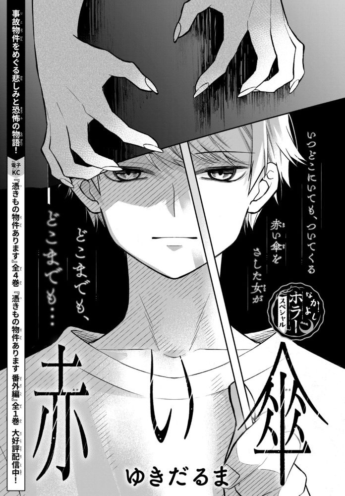 どこまでも、どこまでもついてくる、赤い傘の女――。雨宿りをしていた女の子に傘を貸してから、ずっと付きまとわれ続ける詢は、対決を決意するが…。本当に怖いのはお化け?幽霊?それとも…? 『憑きもの物件あります』の著者が送る戦慄ホラー『赤い傘』(ゆきだるま)。